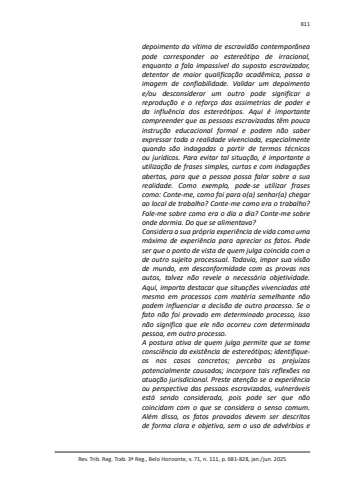 Rev. Trib. Reg. Trab. 3ª Reg., Belo Horizonte, v. 71, n. 111, p. 681-828, jan./jun. 2025811depoimento da vítima de escravidão contemporânea pode corresponder ao estereótipo de irracional, enquanto a fala impassível do suposto escravizador, detentor de maior qualificação acadêmica, passa a imagem de confiabilidade. Validar um depoimento e/ou desconsiderar um outro pode significar a reprodução e o reforço das assimetrias de poder e da influência dos estereótipos. Aqui é importante compreender que as pessoas escravizadas têm pouca instrução educacional formal e podem não saber expressar toda a realidade vivenciada, especialmente quando são indagadas a partir de termos técnicos ou jurídicos. Para evitar tal situação, é importante a utilização de frases simples, curtas e com indagações abertas, para que a pessoa possa falar sobre a sua realidade. Como exemplo, pode-se utilizar frases como: Conte-me, como foi para o(a) senhor(a) chegar ao local de trabalho? Conte-me como era o trabalho? Fale-me sobre como era o dia a dia? Conte-me sobre onde dormia. Do que se alimentava?Considera a sua própria experiência de vida como uma máxima de experiência para apreciar os fatos. Pode ser que o ponto de vista de quem julga coincida com o de outro sujeito processual. Todavia, impor sua visão de mundo, em desconformidade com as provas nos autos, talvez não revele a necessária objetividade. Aqui, importa destacar que situações vivenciadas até mesmo em processos com matéria semelhante não podem influenciar a decisão de outro processo. Se o fato não foi provado em determinado processo, isso não significa que ele não ocorreu com determinada pessoa, em outro processo.A postura ativa de quem julga permite que se tome consciência da existência de estereótipos; identifiqueos nos casos concretos; perceba os prejuízos potencialmente causados; incorpore tais reflexões na atuação jurisdicional. Preste atenção se a experiência ou perspectiva das pessoas escravizadas, vulneráveis está sendo considerada, pois pode ser que não coincidam com o que se considera o senso comum. Além disso, os fatos provados devem ser descritos de forma clara e objetiva, sem o uso de advérbios e