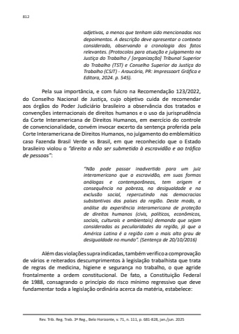 Rev. Trib. Reg. Trab. 3ª Reg., Belo Horizonte, v. 71, n. 111, p. 681-828, jan./jun. 2025812adjetivos, a menos que tenham sido mencionados nos depoimentos. A descrição deve apresentar o contexto considerado, observando a cronologia dos fatos relevantes. (Protocolos para atuação e julgamento na Justiça do Trabalho / [organização] Tribunal Superior do Trabalho (TST) e Conselho Superior da Justiça do Trabalho (CSJT) - Araucária, PR: Impressoart Gráfica e Editora, 2024. p. 545).Pela sua importância, e com fulcro na Recomendação 123/2022, do Conselho Nacional de Justiça, cujo objetivo cuida de recomendar aos órgãos do Poder Judiciário brasileiro a observância dos tratados e convenções internacionais de direitos humanos e o uso da jurisprudência da Corte Interamericana de Direitos Humanos, em exercício do controle de convencionalidade, convém invocar excerto da sentença proferida pela Corte Interamericana de Direitos Humanos, no julgamento do emblemático caso Fazenda Brasil Verde vs Brasil, em que reconhecido que o Estado brasileiro violou o “direito a não ser submetido à escravidão e ao tráfico de pessoas”:“Não pode passar inadvertido para um juiz interamericano que a escravidão, em suas formas análogas e contemporâneas, tem origem e consequência na pobreza, na desigualdade e na exclusão social, repercutindo nas democracias substantivas dos países da região. Deste modo, a análise da experiência interamericana de proteção de direitos humanos (civis, políticos, econômicos, sociais, culturais e ambientais) demanda que sejam consideradas as peculiaridades da região, já que a América Latina é a região com o mais alto grau de desigualdade no mundo”. (Sentença de 20/10/2016)Além das violações supra indicadas, também verifico a comprovação de vários e reiterados descumprimentos à legislação trabalhista que trata de regras de medicina, higiene e segurança no trabalho, o que agride frontalmente a ordem constitucional. De fato, a Constituição Federal de 1988, consagrando o princípio do risco mínimo regressivo que deve fundamentar toda a legislação ordinária acerca da matéria, estabelece: