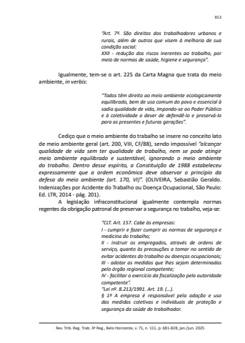Rev. Trib. Reg. Trab. 3ª Reg., Belo Horizonte, v. 71, n. 111, p. 681-828, jan./jun. 2025813“Art. 7º. São direitos dos trabalhadores urbanos e rurais, além de outros que visem à melhoria de sua condição social:XXII - redução dos riscos inerentes ao trabalho, por meio de normas de saúde, higiene e segurança”.Igualmente, tem-se o art. 225 da Carta Magna que trata do meio ambiente, in verbis:“Todos têm direito ao meio ambiente ecologicamente equilibrado, bem de uso comum do povo e essencial à sadia qualidade de vida, impondo-se ao Poder Público e à coletividade o dever de defendê-lo e preservá-lo para as presentes e futuras gerações”.Cediço que o meio ambiente do trabalho se insere no conceito lato de meio ambiente geral (art. 200, VIII, CF/88), sendo impossível “alcançar qualidade de vida sem ter qualidade de trabalho, nem se pode atingir meio ambiente equilibrado e sustentável, ignorando o meio ambiente do trabalho. Dentro desse espírito, a Constituição de 1988 estabeleceu expressamente que a ordem econômica deve observar o princípio da defesa do meio ambiente (art. 170, VI)”. (OLIVEIRA, Sebastião Geraldo. Indenizações por Acidente do Trabalho ou Doença Ocupacional, São Paulo: Ed. LTR, 2014 - pág. 201).A legislação infraconstitucional igualmente contempla normas regentes da obrigação patronal de preservar a segurança no trabalho, veja-se:“CLT. Art. 157. Cabe às empresas:I - cumprir e fazer cumprir as normas de segurança e medicina do trabalho;II - instruir os empregados, através de ordens de serviço, quanto às precauções a tomar no sentido de evitar acidentes do trabalho ou doenças ocupacionais;III - adotar as medidas que lhes sejam determinadas pelo órgão regional competente;IV - facilitar o exercício da fiscalização pela autoridade competente”.“Lei nº. 8.213/1991. Art. 19. (…).§ 1º A empresa é responsável pela adoção e uso das medidas coletivas e individuais de proteção e segurança da saúde do trabalhador.