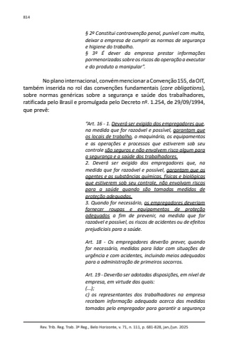 Rev. Trib. Reg. Trab. 3ª Reg., Belo Horizonte, v. 71, n. 111, p. 681-828, jan./jun. 2025814§ 2º Constitui contravenção penal, punível com multa, deixar a empresa de cumprir as normas de segurança e higiene do trabalho.§ 3º É dever da empresa prestar informações pormenorizadas sobre os riscos da operação a executar e do produto a manipular”.No plano internacional, convém mencionar a Convenção 155, da OIT, também inserida no rol das convenções fundamentais (core obligations), sobre normas genéricas sobre a segurança e saúde dos trabalhadores, ratificada pelo Brasil e promulgada pelo Decreto nº. 1.254, de 29/09/1994, que prevê:“Art. 16 - 1. Deverá ser exigido dos empregadores que, na medida que for razoável e possível, garantam que os locais de trabalho, o maquinário, os equipamentos e as operações e processos que estiverem sob seu controle são seguros e não envolvem risco algum para a segurança e a saúde dos trabalhadores.2. Deverá ser exigido dos empregadores que, na medida que for razoável e possível, garantam que os agentes e as substâncias químicas, físicas e biológicas que estiverem sob seu controle, não envolvam riscos para a saúde quando são tomadas medidas de proteção adequadas.3. Quando for necessário, os empregadores deveriam fornecer roupas e equipamentos de proteção adequados a fim de prevenir, na medida que for razoável e possível, os riscos de acidentes ou de efeitos prejudiciais para a saúde.Art. 18 - Os empregadores deverão prever, quando for necessário, medidas para lidar com situações de urgência e com acidentes, incluindo meios adequados para a administração de primeiros socorros.Art. 19 - Deverão ser adotadas disposições, em nível de empresa, em virtude das quais:(...);c) os representantes dos trabalhadores na empresa recebam informação adequada acerca das medidas tomadas pelo empregador para garantir a segurança