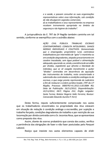 Rev. Trib. Reg. Trab. 3ª Reg., Belo Horizonte, v. 71, n. 111, p. 681-828, jan./jun. 2025815e a saúde, e possam consultar as suas organizações representativas sobre essa informação, sob condição de não divulgarem segredos comerciais;d) os trabalhadores e seus representantes na empresa recebam treinamento apropriado no âmbito da segurança e da higiene do trabalho”.A jurisprudência do E. TRT da 3ª Região também caminha em tal sentido, conforme se exemplifica com o acórdão abaixo:AÇÃO CIVIL PÚBLICA. TRABALHO ESCRAVO CONTEMPORÂNEO. CONDUTA INTOLERÁVEL. DANOS MORAIS INDIVIDUAIS E COLETIVOS. Demonstrado que o empregador, proprietário rural, contratava trabalhadores por intermédio de “gato” e mantinha-os em condições degradantes, alojados precariamente em casebre inacabado, sem água potável e alimentação adequada, apurando-se, ainda, a existência de servidão por dívidas, expediente que afronta a liberdade do indivíduo, que se vê coagido moralmente a quitar “dívidas” contraídas em decorrência da aquisição dos instrumentos de trabalho, resta caracterizada a submissão dos contratados a condições análogas às de escravo, o que exige pronta reprimenda do Judiciário a fim de restaurar a ordem jurídica lesada. (TRT da 3.ª Região; Processo: 0000742-41.2012.5.03.0084 RO; Data de Publicação: 26/11/2012; Disponibilização: 22/11/2012, DEJT, Página 252; Órgão Julgador: Sexta Turma; Relator Rogerio Valle Ferreira; Revisor: Convocado Eduardo Aurelio P. Ferri)Desta forma, reputo suficientemente comprovado nos autos que os trabalhadores encontrados na propriedade dos réus estavam em situação de redução à condição análoga a escravidão, por sujeição a trabalho forçado, condições degradantes de trabalho e por restrição de sua locomoção por dívida contraída com o Sr. Jeconias Rosa, que se apresentava como preposto dos réus.Assim, diante do acervo probatório que consta dos autos, verifico a pertinência das obrigações de fazer e não fazer postuladas pelo ParquetLaboral.Realço que inexiste nos autos elementos capazes de elidir