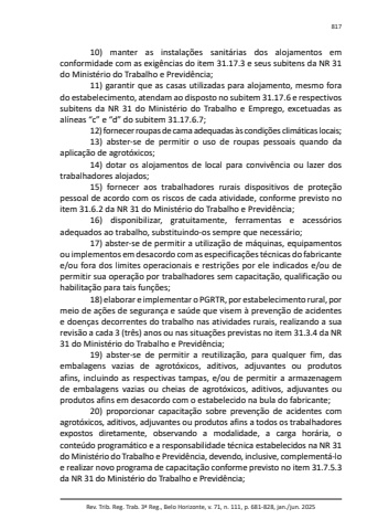 Rev. Trib. Reg. Trab. 3ª Reg., Belo Horizonte, v. 71, n. 111, p. 681-828, jan./jun. 202581710) manter as instalações sanitárias dos alojamentos em conformidade com as exigências do item 31.17.3 e seus subitens da NR 31 do Ministério do Trabalho e Previdência;11) garantir que as casas utilizadas para alojamento, mesmo fora do estabelecimento, atendam ao disposto no subitem 31.17.6 e respectivos subitens da NR 31 do Ministério do Trabalho e Emprego, excetuadas as alíneas “c” e “d” do subitem 31.17.6.7;12) fornecer roupas de cama adequadas às condições climáticas locais;13) abster-se de permitir o uso de roupas pessoais quando da aplicação de agrotóxicos;14) dotar os alojamentos de local para convivência ou lazer dos trabalhadores alojados;15) fornecer aos trabalhadores rurais dispositivos de proteção pessoal de acordo com os riscos de cada atividade, conforme previsto no item 31.6.2 da NR 31 do Ministério do Trabalho e Previdência;16) disponibilizar, gratuitamente, ferramentas e acessórios adequados ao trabalho, substituindo-os sempre que necessário;17) abster-se de permitir a utilização de máquinas, equipamentos ou implementos em desacordo com as especificações técnicas do fabricante e/ou fora dos limites operacionais e restrições por ele indicados e/ou de permitir sua operação por trabalhadores sem capacitação, qualificação ou habilitação para tais funções;18) elaborar e implementar o PGRTR, por estabelecimento rural, por meio de ações de segurança e saúde que visem à prevenção de acidentes e doenças decorrentes do trabalho nas atividades rurais, realizando a sua revisão a cada 3 (três) anos ou nas situações previstas no item 31.3.4 da NR 31 do Ministério do Trabalho e Previdência;19) abster-se de permitir a reutilização, para qualquer fim, das embalagens vazias de agrotóxicos, aditivos, adjuvantes ou produtos afins, incluindo as respectivas tampas, e/ou de permitir a armazenagem de embalagens vazias ou cheias de agrotóxicos, aditivos, adjuvantes ou produtos afins em desacordo com o estabelecido na bula do fabricante;20) proporcionar capacitação sobre prevenção de acidentes com agrotóxicos, aditivos, adjuvantes ou produtos afins a todos os trabalhadores expostos diretamente, observando a modalidade, a carga horária, o conteúdo programático e a responsabilidade técnica estabelecidos na NR 31 do Ministério do Trabalho e Previdência, devendo, inclusive, complementá-lo e realizar novo programa de capacitação conforme previsto no item 31.7.5.3 da NR 31 do Ministério do Trabalho e Previdência;