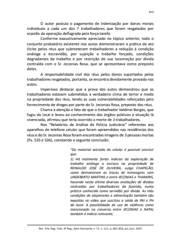 Rev. Trib. Reg. Trab. 3ª Reg., Belo Horizonte, v. 71, n. 111, p. 681-828, jan./jun. 2025819O autor postula o pagamento de indenização por danos morais individuais a cada um dos 7 trabalhadores que foram resgatados por ocasião da operação deflagrada pela força-tarefa.Conforme exaustivamente apreciado no tópico anterior, todo o conjunto probatório existente nos autos demonstraram a prática de ato ilícito pelos réus que submeteram trabalhadores a redução à condição análoga a escravidão, por sujeição a trabalho forçado, condições degradantes de trabalho e por restrição de sua locomoção por dívida contraída com o Sr. Jeconias Rosa, que se apresentava como preposto deles.A responsabilidade civil dos réus pelos danos suportados pelos trabalhadores resgatados, portanto, se encontra devidamente provada nos autos.Imperioso destacar que a prova dos autos demonstrou que os trabalhadores estavam submetidos a verdadeiro clima de terror e medo na propriedade dos réus, tendo as suas vulnerabilidades reforçadas pelo fornecimento de drogas por parte do Sr. Jeconias Rosa, preposto dos réus.Chama a atenção o fato de que o trabalhador Valdinei Borges, que fugiu do local e levou ao conhecimento dos órgãos públicos a situação lá vivenciada, afirmou que teria ocorrido a morte de 3 trabalhadores.Nos “Relatórios de Análise de Polícia Judiciária” referentes aos aparelhos de telefone celular que foram apreendidos nas residências dos réus e do Sr. Jeconias Rosa foram encontradas imagens de 3 pessoas mortas (fls. 535 e 536), constando a seguinte conclusão:“Do material extraído do celular é possível concluir que:1) Há realmente fortes indícios da exploração de trabalho análogo a escravo na propriedade de REINALDO JOSÉ DE OLIVEIRA, vulgo CHAPELÃO, como demonstram as trocas de mensagens com LINDEBERTO MARTINS e entre JECONIAS e THAMIRIS, havendo nesta última diversas anotações de dívidas contraídas por trabalhadores da fazenda, numa prática conhecida como servidão por dívida. As más condições de alojamento e alimentação também são expostas no vídeo que suscitou a saída de PAI e PH do local. A possibilidade de uso de violência como mencionado na conversa entre JECONIAS e NATAL também é indício relevante;