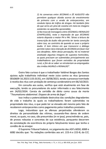 Rev. Trib. Reg. Trab. 3ª Reg., Belo Horizonte, v. 71, n. 111, p. 681-828, jan./jun. 20258202) As conversas entre JECONIAS e ZÉ AUGUSTO não permitem qualquer dúvida acerca do envolvimento do primeiro com a venda de entorpecentes, em conduta típica de tráfico de drogas. Há também foto do que seria um pino de cocaína em meio às imagens existentes no aparelho apreendido;3) Na troca de mensagens entre JECONIAS e REINALDO (CHAPELUDO), resta a impressão de que JECONIAS estaria disposto a matar PH e PAI. Talvez a leitura da transcrição do áudio não permita ter tanta convicção sobre isso, ao contrário de quando se ouve o próprio áudio. O tom irônico em que transcorre o diálogo permite notar clara intenção de JECONIAS em fazer mal aos desafetos. Além dessa percepção, há no material analisado algumas imagens de supostos homicídios, as quais precisam ser submetidas principalmente aos trabalhadores que foram extraídos da propriedade rural, a fim de se saber se retratariam ex-empregados dos irmãos MURILO e REINALDO”.Outro fato curioso é que o trabalhador Valdinei Borges dos Santos ajuizou ação trabalhista individual neste Juízo contra os réus (processo 0010609-16.2023.5.03.0135), em 18/08/2023, tendo o processo tramitado à revelia dos réus com prolação de sentença condenatória em 06/10/2023.Em consulta aos autos, verifico que está atualmente em fase de execução, tendo os procuradores do autor informado o seu falecimento em 24/02/2024. Consta da certidão de óbito como causa da morte “Traumatismo abdominal. Disparo de arma de fogo”.Isso indica a potencialidade destrutiva das condições degradantes de vida e trabalho às quais os trabalhadores foram submetidos na propriedade dos réus, o que pode ter se elevado até mesmo pelo fato de receberem entorpecentes como pagamento pelos trabalhos prestados.Logo, induvidoso que as ofensas perpetradas ofenderam os direitos da personalidade das vítimas, causando-lhes danos de ordem moral, os quais, no caso, são presumidos (in re ipsa), prescindindo-se, pois, de provas robustas e concretas de sua existência, porquanto decorrem da constatação da ocorrência do próprio fato/evento lesivo que tenha o condão de os ensejar.O Supremo Tribunal Federal, no julgamento das ADI’s 6050, 6069 e 6082 decidiu que: “As redações conferidas aos art. 223-A e 223-B, da CLT,