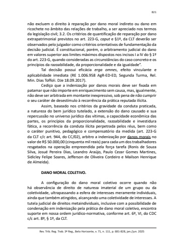 Rev. Trib. Reg. Trab. 3ª Reg., Belo Horizonte, v. 71, n. 111, p. 681-828, jan./jun. 2025821não excluem o direito à reparação por dano moral indireto ou dano em ricochete no âmbito das relações de trabalho, a ser apreciado nos termos da legislação civil; 3.2. Os critérios de quantificação de reparação por dano extrapatrimonial previstos no art. 223-G, caput e §1º, da CLT deverão ser observados pelo julgador como critérios orientativos de fundamentação da decisão judicial. É constitucional, porém, o arbitramento judicial do dano em valores superior aos limites máximos dispostos nos incisos I a IV do § 1º do art. 223-G, quando consideradas as circunstâncias do caso concreto e os princípios da razoabilidade, da proporcionalidade e da igualdade”.Tal decisão possui eficácia erga omnes, efeito vinculante e aplicabilidade imediata (RE 1.006.958 AgR-ED-ED, Segunda Turma, Rel. Min. Dias Toffoli. DJe 18.09.2017).Cediço que a indenização por danos morais deve ser fixada em patamar que não importe em enriquecimento sem causa, mas, igualmente, não deve ser arbitrada em montante inexpressivo, sob pena de não cumprir o seu caráter de desestímulo à recorrência da prática reputada ilícita.Assim, baseado nos critérios da gravidade da conduta praticada, a natureza do bem jurídico tutelado, a extensão do dano causado e sua repercussão no universo jurídico das vítimas, a capacidade econômica das partes, os princípios da proporcionalidade, razoabilidade e investidura fática, a recorrência da conduta ilícita perpetrada pelos réus, bem como o caráter punitivo, pedagógico e compensatório da medida (art. 223-G da CLT c/c art. 944, do CC/02), arbitro a indenização por danos morais no valor de R$ 50.000,00 (cinquenta mil reais) para cada um dos trabalhadores resgatados na operação empreendida pela força tarefa (Ronis de Souza Silva, Josué Pereira Dias, Leandro Araújo, Paulo Cezar Gomes Martines, Sidicley Felipe Soares, Jefferson de Oliveira Cordeiro e Mailson Henrique de Almeida).DANO MORAL COLETIVO.A configuração do dano moral coletivo ocorre quando não há observância de direito de natureza imaterial de um grupo ou da coletividade, ultrapassando a esfera de interesses meramente individuais, ainda que também atingidos, alcançando uma coletividade de interesses. A tutela judicial de direitos metaindividuais, inclusive com a possibilidade de condenação em indenização pela prática de dano moral coletivo, encontra suporte em nossa ordem jurídico-normativa, conforme art. 6º, VI, do CDC c/c art. 8º, § 1º, da CLT.