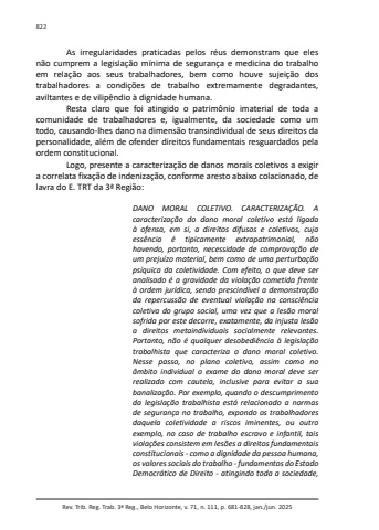 Rev. Trib. Reg. Trab. 3ª Reg., Belo Horizonte, v. 71, n. 111, p. 681-828, jan./jun. 2025822As irregularidades praticadas pelos réus demonstram que eles não cumprem a legislação mínima de segurança e medicina do trabalho em relação aos seus trabalhadores, bem como houve sujeição dos trabalhadores a condições de trabalho extremamente degradantes, aviltantes e de vilipêndio à dignidade humana.Resta claro que foi atingido o patrimônio imaterial de toda a comunidade de trabalhadores e, igualmente, da sociedade como um todo, causando-lhes dano na dimensão transindividual de seus direitos da personalidade, além de ofender direitos fundamentais resguardados pela ordem constitucional.Logo, presente a caracterização de danos morais coletivos a exigir a correlata fixação de indenização, conforme aresto abaixo colacionado, de lavra do E. TRT da 3ª Região:DANO MORAL COLETIVO. CARACTERIZAÇÃO. A caracterização do dano moral coletivo está ligada à ofensa, em si, a direitos difusos e coletivos, cuja essência é tipicamente extrapatrimonial, não havendo, portanto, necessidade de comprovação de um prejuízo material, bem como de uma perturbação psíquica da coletividade. Com efeito, o que deve ser analisado é a gravidade da violação cometida frente à ordem jurídica, sendo prescindível a demonstração da repercussão de eventual violação na consciência coletiva do grupo social, uma vez que a lesão moral sofrida por este decorre, exatamente, da injusta lesão a direitos metaindividuais socialmente relevantes. Portanto, não é qualquer desobediência à legislação trabalhista que caracteriza o dano moral coletivo. Nesse passo, no plano coletivo, assim como no âmbito individual o exame do dano moral deve ser realizado com cautela, inclusive para evitar a sua banalização. Por exemplo, quando o descumprimento da legislação trabalhista está relacionado a normas de segurança no trabalho, expondo os trabalhadores daquela coletividade a riscos iminentes, ou outro exemplo, no caso de trabalho escravo e infantil, tais violações consistem em lesões a direitos fundamentais constitucionais - como a dignidade da pessoa humana, os valores sociais do trabalho - fundamentos do Estado Democrático de Direito - atingindo toda a sociedade,