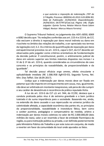 Rev. Trib. Reg. Trab. 3ª Reg., Belo Horizonte, v. 71, n. 111, p. 681-828, jan./jun. 2025823o que autoriza a imposição de indenização. (TRT da 3.ª Região; Processo: 0000556-45.2013.5.03.0096 RO; Data de Publicação: 25/04/2014; Disponibilização: 24/04/2014, DEJT/TRT3/Cad.Jud, Página 146; Órgão Julgador: Quinta Turma; Relator Marcio Flavio Salem Vidigal; Revisor: Marcus Moura Ferreira)O Supremo Tribunal Federal, no julgamento das ADI’s 6050, 6069 e 6082 decidiu que: “As redações conferidas aos art. 223-A e 223-B, da CLT, não excluem o direito à reparação por dano moral indireto ou dano em ricochete no âmbito das relações de trabalho, a ser apreciado nos termos da legislação civil; 3.2. Os critérios de quantificação de reparação por dano extrapatrimonial previstos no art. 223-G, caput e §1º, da CLT deverão ser observados pelo julgador como critérios orientativos de fundamentação da decisão judicial. É constitucional, porém, o arbitramento judicial do dano em valores superior aos limites máximos dispostos nos incisos I a IV do § 1º do art. 223-G, quando consideradas as circunstâncias do caso concreto e os princípios da razoabilidade, da proporcionalidade e da igualdade”.Tal decisão possui eficácia erga omnes, efeito vinculante e aplicabilidade imediata (RE 1.006.958 AgR-ED-ED, Segunda Turma, Rel. Min. Dias Toffoli. DJe 18.09.2017).Cediço que a indenização por danos morais deve ser fixada em patamar que não importe em enriquecimento sem causa, mas, igualmente, não deve ser arbitrada em montante inexpressivo, sob pena de não cumprir o seu caráter de desestímulo à recorrência da prática reputada ilícita.À luz do art. 223-G da CLT c/c art. 944, do CC/02, destaco que a conduta praticada pelos réus é de extrema gravidade e o bem jurídico tutelado é de suma importância para a sociedade. Baseando-me, ainda, na extensão do dano causado e sua repercussão no universo jurídico da coletividade afetada, a capacidade econômica das partes rés, os princípios da proporcionalidade, razoabilidade e investidura fática, bem como o caráter punitivo, pedagógico e compensatório da medida, arbitro a indenização por danos morais coletivos no valor de R$ 2.000.000,00 (dois milhões de reais), valor a ser revertido a favor de entidade filantrópica da região, ou para instituição pública ou privada, a ser definida posteriormente pelo Ministério Público do Trabalho e por este Juízo em conjunto, de modo a reverter em favor da comunidade do local onde apurados os fatos.