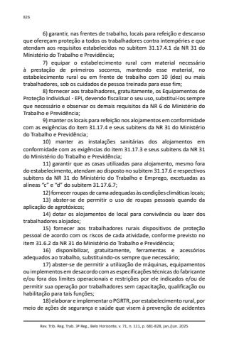 Rev. Trib. Reg. Trab. 3ª Reg., Belo Horizonte, v. 71, n. 111, p. 681-828, jan./jun. 20258266) garantir, nas frentes de trabalho, locais para refeição e descanso que ofereçam proteção a todos os trabalhadores contra intempéries e que atendam aos requisitos estabelecidos no subitem 31.17.4.1 da NR 31 do Ministério do Trabalho e Previdência;7) equipar o estabelecimento rural com material necessário à prestação de primeiros socorros, mantendo esse material, no estabelecimento rural ou em frente de trabalho com 10 (dez) ou mais trabalhadores, sob os cuidados de pessoa treinada para esse fim;8) fornecer aos trabalhadores, gratuitamente, os Equipamentos de Proteção Individual - EPI, devendo fiscalizar o seu uso, substituí-los sempre que necessário e observar os demais requisitos da NR 6 do Ministério do Trabalho e Previdência;9) manter os locais para refeição nos alojamentos em conformidade com as exigências do item 31.17.4 e seus subitens da NR 31 do Ministério do Trabalho e Previdência;10) manter as instalações sanitárias dos alojamentos em conformidade com as exigências do item 31.17.3 e seus subitens da NR 31 do Ministério do Trabalho e Previdência;11) garantir que as casas utilizadas para alojamento, mesmo fora do estabelecimento, atendam ao disposto no subitem 31.17.6 e respectivos subitens da NR 31 do Ministério do Trabalho e Emprego, excetuadas as alíneas “c” e “d” do subitem 31.17.6.7;12) fornecer roupas de cama adequadas às condições climáticas locais;13) abster-se de permitir o uso de roupas pessoais quando da aplicação de agrotóxicos;14) dotar os alojamentos de local para convivência ou lazer dos trabalhadores alojados;15) fornecer aos trabalhadores rurais dispositivos de proteção pessoal de acordo com os riscos de cada atividade, conforme previsto no item 31.6.2 da NR 31 do Ministério do Trabalho e Previdência;16) disponibilizar, gratuitamente, ferramentas e acessórios adequados ao trabalho, substituindo-os sempre que necessário;17) abster-se de permitir a utilização de máquinas, equipamentos ou implementos em desacordo com as especificações técnicas do fabricante e/ou fora dos limites operacionais e restrições por ele indicados e/ou de permitir sua operação por trabalhadores sem capacitação, qualificação ou habilitação para tais funções;18) elaborar e implementar o PGRTR, por estabelecimento rural, por meio de ações de segurança e saúde que visem à prevenção de acidentes