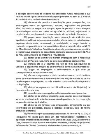 Rev. Trib. Reg. Trab. 3ª Reg., Belo Horizonte, v. 71, n. 111, p. 681-828, jan./jun. 2025827e doenças decorrentes do trabalho nas atividades rurais, realizando a sua revisão a cada 3 (três) anos ou nas situações previstas no item 31.3.4 da NR 31 do Ministério do Trabalho e Previdência;19) abster-se de permitir a reutilização, para qualquer fim, das embalagens vazias de agrotóxicos, aditivos, adjuvantes ou produtos afins, incluindo as respectivas tampas, e/ou de permitir a armazenagem de embalagens vazias ou cheias de agrotóxicos, aditivos, adjuvantes ou produtos afins em desacordo com o estabelecido na bula do fabricante;20) proporcionar capacitação sobre prevenção de acidentes com agrotóxicos, aditivos, adjuvantes ou produtos afins a todos os trabalhadores expostos diretamente, observando a modalidade, a carga horária, o conteúdo programático e a responsabilidade técnica estabelecidos na NR 31 do Ministério do Trabalho e Previdência, devendo, inclusive, complementá-lo e realizar novo programa de capacitação conforme previsto no item 31.7.5.3 da NR 31 do Ministério do Trabalho e Previdência;21) abster-se de admitir ou manter empregado sem o respectivo registro em CTPS e em livro, ficha ou sistema eletrônico competente;22) efetuar, até o 5˚ (quinto) dia útil do mês subsequente ao vencido, o pagamento integral do salário mensal devido aos empregados;23) pagar ao empregado a remuneração a que fizer jus correspondente ao repouso semanal;24) efetuar o pagamento, a título de adiantamento do 13º salário, entre os meses de fevereiro e novembro de cada ano, da metade do salário recebido pelos empregados, no mês anterior, conforme faculdade prevista na legislação;25) efetuar o pagamento do 13º salário até o dia 20 (vinte) de dezembro de cada ano;26) conceder aos empregados as férias anuais a que fazem jus;27) abster-se de efetuar descontos nos salários dos empregados, salvo os resultantes de adiantamentos, dos dispositivos de lei, convenção ou acordo coletivo de trabalho;28) abster-se de fornecer aos empregados, diretamente ou por intermédio de prepostos, drogas e bebidas alcoólicas, seja de forma gratuita ou onerosa;29) indenização por danos morais individuais no valor de R$ 50.000,00 (cinquenta mil reais) para cada um dos trabalhadores resgatados na operação empreendida pela força tarefa (Ronis de Souza Silva, Josué Pereira Dias, Leandro Araújo, Paulo Cezar Gomes Martines, Sidicley Felipe Soares, Jefferson de Oliveira Cordeiro e Mailson Henrique de Almeida); e