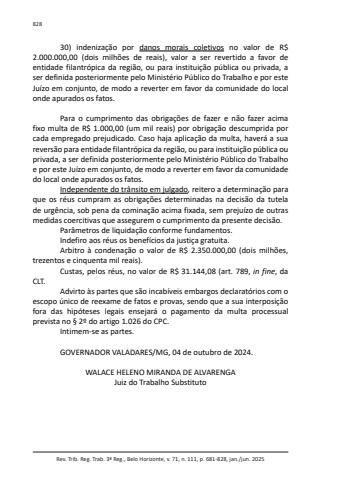 Rev. Trib. Reg. Trab. 3ª Reg., Belo Horizonte, v. 71, n. 111, p. 681-828, jan./jun. 202582830) indenização por danos morais coletivos no valor de R$ 2.000.000,00 (dois milhões de reais), valor a ser revertido a favor de entidade filantrópica da região, ou para instituição pública ou privada, a ser definida posteriormente pelo Ministério Público do Trabalho e por este Juízo em conjunto, de modo a reverter em favor da comunidade do local onde apurados os fatos.Para o cumprimento das obrigações de fazer e não fazer acima fixo multa de R$ 1.000,00 (um mil reais) por obrigação descumprida por cada empregado prejudicado. Caso haja aplicação da multa, haverá a sua reversão para entidade filantrópica da região, ou para instituição pública ou privada, a ser definida posteriormente pelo Ministério Público do Trabalho e por este Juízo em conjunto, de modo a reverter em favor da comunidade do local onde apurados os fatos.Independente do trânsito em julgado, reitero a determinação para que os réus cumpram as obrigações determinadas na decisão da tutela de urgência, sob pena da cominação acima fixada, sem prejuízo de outras medidas coercitivas que assegurem o cumprimento da presente decisão.Parâmetros de liquidação conforme fundamentos.Indefiro aos réus os benefícios da justiça gratuita.Arbitro à condenação o valor de R$ 2.350.000,00 (dois milhões, trezentos e cinquenta mil reais).Custas, pelos réus, no valor de R$ 31.144,08 (art. 789, in fine, da CLT.Advirto às partes que são incabíveis embargos declaratórios com o escopo único de reexame de fatos e provas, sendo que a sua interposição fora das hipóteses legais ensejará o pagamento da multa processual prevista no § 2º do artigo 1.026 do CPC.Intimem-se as partes.GOVERNADOR VALADARES/MG, 04 de outubro de 2024.WALACE HELENO MIRANDA DE ALVARENGAJuiz do Trabalho Substituto