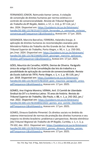 Rev. Trib. Reg. Trab. 3ª Reg., Belo Horizonte, v. 71, n. 111, p. 831-838, jan./jun. 2025834FERNANDES JÚNIOR, Raimundo Itamar Lemos. A violação de convenção de direitos humanos por norma coletiva e o controle de convencionalidade. Revista do Tribunal Regional do Trabalho da 8ª Região, Belém, v. 57, n. 113, p. 97-114, jul./dez. 2024. Disponível em: https://juslaboris.tst.jus.br/bitstream/handle/20.500.12178/251077/2024_fernandes_jr_raimundo_violacao_convencao.pdf?sequence=1&isAllowed=y. Acesso em: 17 jun. 2025.GESSINGER, Marcirio Barcellos; FERREIRA, Halandra Araujo. A aplicação de direitos humanos às recomendações exaradas pelo Ministério Público do Trabalho do Rio Grande do Sul. Revista do Tribunal Superior do Trabalho, Porto Alegre, v. 90, n. 1, p. 250-265, jan./mar. 2024. Disponível em: https://juslaboris.tst.jus.br/bitstream/handle/20.500.12178/234695/2024_gessinger_marcirio_aplicacao_direitos.pdf?sequence=1&isAllowed=y. Acesso em: 17 jun. 2025.GÓES, Maurício de Carvalho; HORTA, Denise de Oliveira. Parágrafo único do artigo 611-B da Consolidação das leis do trabalho e a possibilidade de aplicação do controle de convencionalidade. Revista da Escola Judicial do TRT4, Porto Alegre, v. 1, n. 1, p. 95-119, jan./jun. 2019. Disponível em: https://juslaboris.tst.jus.br/bitstream/handle/20.500.12178/197578/2019_goes_mauricio_paragrafo_unico.pdf?sequence=1&isAllowed=y. Acesso em: 17 jun. 2025.GOMES, Ana Virginia Moreira; VERMA, Anil. O Comitê de Liberdade Sindical da OIT e a América Latina: 70 anos de história. Revista do Tribunal Superior do Trabalho, São Paulo, v. 88, n. 1, p. 242-262, jan./mar. 2022. Disponível em: https://juslaboris.tst.jus.br/bitstream/handle/20.500.12178/203855/2022_gomes_ana_comite_liberdade.pdf?sequence=1&isAllowed=y. Acesso em: 17 jun. 2025.GOMES, Dinaura Godinho Pimentel. Os direitos sociais no âmbito do sistema internacional de normas de proteção dos direitos humanos e seu impacto no direito brasileiro: problemas e perspectivas. Revista eletrônica [do] Tribunal Regional do Trabalho da 9ª Região, Curitiba, v. 1, n. 3, p. 79-102, dez. 2011. Disponível em: https://juslaboris.tst.jus.br/bitstream/handle/20.500.12178/97621/2011_gomes_dinaura_direitos_sociais.pdf?sequence=1&isAllowed=y. Acesso em: 17 jun. 2025.