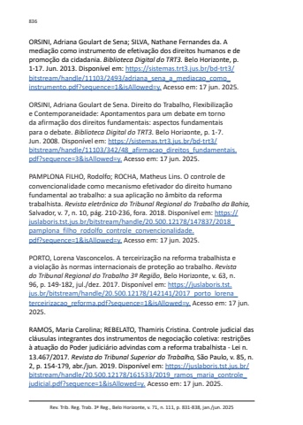 Rev. Trib. Reg. Trab. 3ª Reg., Belo Horizonte, v. 71, n. 111, p. 831-838, jan./jun. 2025836ORSINI, Adriana Goulart de Sena; SILVA, Nathane Fernandes da. A mediação como instrumento de efetivação dos direitos humanos e de promoção da cidadania. Biblioteca Digital do TRT3. Belo Horizonte, p. 1-17. Jun. 2013. Disponível em: https://sistemas.trt3.jus.br/bd-trt3/bitstream/handle/11103/2493/adriana_sena_a_mediacao_como_instrumento.pdf?sequence=1&isAllowed=y. Acesso em: 17 jun. 2025.ORSINI, Adriana Goulart de Sena. Direito do Trabalho, Flexibilização e Contemporaneidade: Apontamentos para um debate em torno da afirmação dos direitos fundamentais: aspectos fundamentais para o debate. Biblioteca Digital do TRT3. Belo Horizonte, p. 1-7. Jun. 2008. Disponível em: https://sistemas.trt3.jus.br/bd-trt3/bitstream/handle/11103/342/48_afirmacao_direitos_fundamentais.pdf?sequence=3&isAllowed=y. Acesso em: 17 jun. 2025.PAMPLONA FILHO, Rodolfo; ROCHA, Matheus Lins. O controle de convencionalidade como mecanismo efetivador do direito humano fundamental ao trabalho: a sua aplicação no âmbito da reforma trabalhista. Revista eletrônica do Tribunal Regional do Trabalho da Bahia,Salvador, v. 7, n. 10, pág. 210-236, fora. 2018. Disponível em: https://juslaboris.tst.jus.br/bitstream/handle/20.500.12178/147837/2018_pamplona_filho_rodolfo_controle_convencionalidade.pdf?sequence=1&isAllowed=y. Acesso em: 17 jun. 2025.PORTO, Lorena Vasconcelos. A terceirização na reforma trabalhista e a violação às normas internacionais de proteção ao trabalho. Revista do Tribunal Regional do Trabalho 3ª Região, Belo Horizonte, v. 63, n. 96, p. 149-182, jul./dez. 2017. Disponível em: https://juslaboris.tst.jus.br/bitstream/handle/20.500.12178/142141/2017_porto_lorena_terceirizacao_reforma.pdf?sequence=1&isAllowed=y. Acesso em: 17 jun. 2025.RAMOS, Maria Carolina; REBELATO, Thamiris Cristina. Controle judicial das cláusulas integrantes dos instrumentos de negociação coletiva: restrições à atuação do Poder judiciário advindas com a reforma trabalhista - Lei n. 13.467/2017. Revista do Tribunal Superior do Trabalho, São Paulo, v. 85, n. 2, p. 154-179, abr./jun. 2019. Disponível em: https://juslaboris.tst.jus.br/bitstream/handle/20.500.12178/161533/2019_ramos_maria_controle_judicial.pdf?sequence=1&isAllowed=y. Acesso em: 17 jun. 2025.