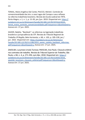 Rev. Trib. Reg. Trab. 3ª Reg., Belo Horizonte, v. 71, n. 111, p. 831-838, jan./jun. 2025838TONIAL, Maira Angélica Dal Conte; PIUCCO, Micheli. Controle de convencionalidade das leis: o caso Lagos del Campo e seus reflexos na reforma trabalhista brasileira. Revista da Escola Judicial do TRT4, Porto Alegre, v. 1, n. 1, p. 15-39, jan./jun. 2019. Disponível em: https://juslaboris.tst.jus.br/bitstream/handle/20.500.12178/197414/2019_tonial_maira_controle_convencionalidade.pdf?sequence=1&isAllowed=y.Acesso em: 17 jun. 2025.XAVIER, Natália. “Backlash”: as reformas na legislação trabalhista brasileira e jurisprudência do STF. Revista do Tribunal Regional do Trabalho 3ª Região, Belo Horizonte, v. 68, n. 105, p. 205-228, jan./jun. 2022. Disponível em: https://juslaboris.tst.jus.br/bitstream/handle/20.500.12178/211198/2022_xavier_natalia_backlash_reformas.pdf?sequence=1&isAllowed=y. Acesso em: 17 jun. 2025.ZAVOLSKI, Lucymara Ursola Turesso; PAVELSKI, Ana Paula. Cláusula arbitral nos contratos de trabalho. Revista do Tribunal Superior do Trabalho, São Paulo, v. 84, n. 4, p. 271-293, out./dez. 2018. Disponível em: https://juslaboris.tst.jus.br/bitstream/handle/20.500.12178/152033/2018_zavolski_lucymara_clausula_arbitral.pdf?sequence=1&isAllowed=y.Acesso em: 17 jun. 2025.