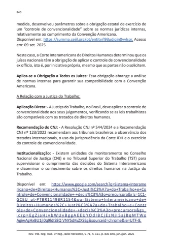 Rev. Trib. Reg. Trab. 3ª Reg., Belo Horizonte, v. 71, n. 111, p. 839-840, jan./jun. 2025840medida, desenvolveu parâmetros sobre a obrigação estatal de exercício de um “controle de convencionalidade” sobre as normas jurídicas internas, relativamente ao cumprimento da Convenção Americana.Disponível em: https://summa.cejil.org/pt/entity/l93udjqjn0vvlsor. Acesso em: 09 set. 2025.Neste caso, a Corte Interamericana de Direitos Humanos determinou que os juízes nacionais têm a obrigação de aplicar o controle de convencionalidade ex officio, isto é, por iniciativa própria, mesmo que as partes não o solicitem. Aplica-se a Obrigação a Todos os Juízes: Essa obrigação abrange a análise de normas internas para garantir sua compatibilidade com a Convenção Americana.A Relação com a Justiça do Trabalho:Aplicação Direta: - A Justiça do Trabalho, no Brasil, deve aplicar o controle de convencionalidade aos seus julgamentos, verificando se as leis trabalhistas são compatíveis com os tratados de direitos humanos.Recomendação do CNJ: - A Resolução CNJ nº 544/2024 e a Recomendação CNJ nº 123/2022 recomendam aos tribunais brasileiros a observância dos tratados internacionais, o uso da jurisprudência da Corte IDH e o exercício do controle de convencionalidade.Institucionalização: - Existem unidades de monitoramento no Conselho Nacional de Justiça (CNJ) e no Tribunal Superior do Trabalho (TST) para supervisionar o cumprimento das decisões do Sistema Interamericano e disseminar o conhecimento sobre os direitos humanos na Justiça do Trabalho.Disponível em: https://www.google.com/search?q=Sistema+Interamericano+de+Direitos+Humanos%2C+Justi%C3%A7a+do+Trabalho+e+Controle+de+Convencionalidade+-+decis%C3%A3o+precursora&rlz=1C1-GCEU_pt-PTBR1149BR1154&oq=Sistema+Interamericano+de+Direitos+Humanos%2C+Justi%C3%A7a+do+Trabalho+e+Controle+de+Convencionalidade+-+decis%C3%A3o+precursora&gs_l c r p = E g Z j a H J v b W U y B g g A E E U Y O d I B C j E z N j I 5 a j B q M T W o AgiwAgHxBU1jl0q9ldIS8Q VNY5dKvZXSEg&sourceid=chrome&ie=UTF-8.