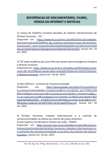 Rev. Trib. Reg. Trab. 3ª Reg., Belo Horizonte, v. 71, n. 111, p. 841-842, jan./jun. 2025841REFERÊNCIAS DE DOCUMENTÁROS, FILMES,VÍDEOS DA INTERNET E NOTÍCIAS1) Justiça do Trabalho monitora decisões do Sistema Interamericano de Direitos Humanos - TSTDisponível em: https://www.tst.jus.br/en/-/justi%C3%A7a-do-trabalhomonitora-decis%C3%B5es-do-sistema-interamericano-de-direitoshumanos#:~:text=Como%20%C3%A9%20o%20tr%C3%A2mite%20dos,enviado%20para%20julgamento%20pela%20CorteIDH. Acesso em: 10 set. 2025.2) TST sedia audiência da Corte IDH com pauta sobre emergência climática e direitos humanosDisponível em: https://www.tst.jus.br/en/-/tst-sedia-audi%C3%AAncia-dacorte-idh-%C2%A0com-pauta-sobre-emerg%C3%AAncia-clim%C3%A1ticae-direitos-humanos. Acesso em: 10 set. 2025.3) AGU EXPLICA - Controle de ConvencionalidadeDisponível em: https://www.google.com/search?q=controle+de+convencionalidade+-congresso&rlz=1C1GCEU_pt-PTBR1149BR1154&oq=controle+de+convencionalidade+-congresso&gs_ l c r p = E g Z j a H J v b W U y B g g A E E U Y O d I B C j E 4 M D U 4 a j B q M T W o AgiwAgHxBSxOOZQ-_zFh8QUsTjmUPv8xYQ&sourceid=chrome&ie=UTF8#fpstate=ive&vld=cid:04971d49,vid:Vd-qg4OPPqw,st:0. Acesso em: 10 set. 2025.4) Direitos Humanos, tratados internacionais e o controle de convencionalidade na prática do sistema de justiça brasileiroEscola Superior do Ministério Público da União - ESMPUDisponível em: https://escola.mpu.mp.br/plataforma-aprender/acervoeducacional/conteudo/direitos-humanos-tratados-internacionais-eo-controle-de-convencionalidade-na-pratica-do-sistema-de-justicabrasileiro. Acesso em: 10 set. 2025.
