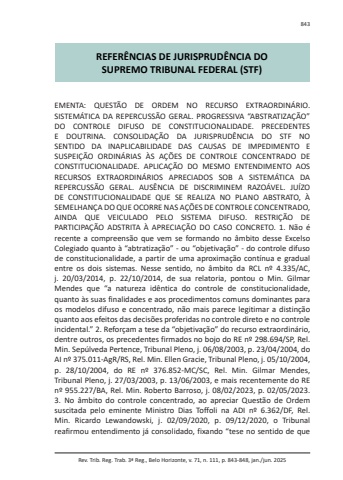 Rev. Trib. Reg. Trab. 3ª Reg., Belo Horizonte, v. 71, n. 111, p. 843-848, jan./jun. 2025843REFERÊNCIAS DE JURISPRUDÊNCIA DOSUPREMO TRIBUNAL FEDERAL (STF)EMENTA: QUESTÃO DE ORDEM NO RECURSO EXTRAORDINÁRIO. SISTEMÁTICA DA REPERCUSSÃO GERAL. PROGRESSIVA “ABSTRATIZAÇÃO” DO CONTROLE DIFUSO DE CONSTITUCIONALIDADE. PRECEDENTES E DOUTRINA. CONSOLIDAÇÃO DA JURISPRUDÊNCIA DO STF NO SENTIDO DA INAPLICABILIDADE DAS CAUSAS DE IMPEDIMENTO E SUSPEIÇÃO ORDINÁRIAS ÀS AÇÕES DE CONTROLE CONCENTRADO DE CONSTITUCIONALIDADE. APLICAÇÃO DO MESMO ENTENDIMENTO AOS RECURSOS EXTRAORDINÁRIOS APRECIADOS SOB A SISTEMÁTICA DA REPERCUSSÃO GERAL. AUSÊNCIA DE DISCRIMINEM RAZOÁVEL. JUÍZO DE CONSTITUCIONALIDADE QUE SE REALIZA NO PLANO ABSTRATO, À SEMELHANÇA DO QUE OCORRE NAS AÇÕES DE CONTROLE CONCENTRADO, AINDA QUE VEICULADO PELO SISTEMA DIFUSO. RESTRIÇÃO DE PARTICIPAÇÃO ADSTRITA À APRECIAÇÃO DO CASO CONCRETO. 1. Não é recente a compreensão que vem se formando no âmbito desse Excelso Colegiado quanto à “abtratização” - ou “objetivação” - do controle difuso de constitucionalidade, a partir de uma aproximação contínua e gradual entre os dois sistemas. Nesse sentido, no âmbito da RCL nº 4.335/AC, j. 20/03/2014, p. 22/10/2014, de sua relatoria, pontou o Min. Gilmar Mendes que “a natureza idêntica do controle de constitucionalidade, quanto às suas finalidades e aos procedimentos comuns dominantes para os modelos difuso e concentrado, não mais parece legitimar a distinção quanto aos efeitos das decisões proferidas no controle direto e no controle incidental.” 2. Reforçam a tese da “objetivação” do recurso extraordinário, dentre outros, os precedentes firmados no bojo do RE nº 298.694/SP, Rel. Min. Sepúlveda Pertence, Tribunal Pleno, j. 06/08/2003, p. 23/04/2004, do AI nº 375.011-AgR/RS, Rel. Min. Ellen Gracie, Tribunal Pleno, j. 05/10/2004, p. 28/10/2004, do RE nº 376.852-MC/SC, Rel. Min. Gilmar Mendes, Tribunal Pleno, j. 27/03/2003, p. 13/06/2003, e mais recentemente do RE nº 955.227/BA, Rel. Min. Roberto Barroso, j. 08/02/2023, p. 02/05/2023. 3. No âmbito do controle concentrado, ao apreciar Questão de Ordem suscitada pelo eminente Ministro Dias Toffoli na ADI nº 6.362/DF, Rel. Min. Ricardo Lewandowski, j. 02/09/2020, p. 09/12/2020, o Tribunal reafirmou entendimento já consolidado, fixando “tese no sentido de que