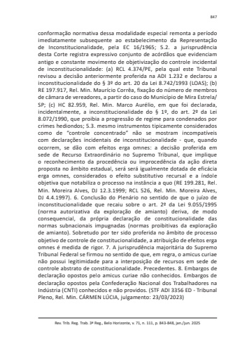 Rev. Trib. Reg. Trab. 3ª Reg., Belo Horizonte, v. 71, n. 111, p. 843-848, jan./jun. 2025847conformação normativa dessa modalidade especial remonta a período imediatamente subsequente ao estabelecimento da Representação de Inconstitucionalidade, pela EC 16/1965; 5.2. a jurisprudência desta Corte registra expressivo conjunto de acórdãos que evidenciam antigo e constante movimento de objetivização do controle incidental de inconstitucionalidade: (a) RCL 4.374/PE, pela qual este Tribunal revisou a decisão anteriormente proferida na ADI 1.232 e declarou a inconstitucionalidade do § 3º do art. 20 da Lei 8.742/1993 (LOAS); (b) RE 197.917, Rel. Min. Maurício Corrêa, fixação do número de membros de câmara de vereadores, a partir do caso do Município de Mira Estrela/SP; (c) HC 82.959, Rel. Min. Marco Aurélio, em que foi declarada, incidentalmente, a inconstitucionalidade do § 1º, do art. 2º da Lei 8.072/1990, que proibia a progressão de regime para condenados por crimes hediondos; 5.3. mesmo instrumentos tipicamente considerados como de “controle concentrado” não se mostram incompatíveis com declarações incidentais de inconstitucionalidade - que, quando ocorrem, se dão com efeitos erga omnes: a decisão proferida em sede de Recurso Extraordinário no Supremo Tribunal, que implique o reconhecimento da procedência ou improcedência da ação direta proposta no âmbito estadual, será será igualmente dotada de eficácia erga omnes, considerados o efeito substitutivo recursal e a índole objetiva que notabiliza o processo na instância a quo (RE 199.281, Rel. Min. Moreira Alves, DJ 12.3.1999; RCL 526, Rel. Min. Moreira Alves, DJ 4.4.1997). 6. Conclusão do Plenário no sentido de que o juízo de inconstitucionalidade que recaiu sobre o art. 2º da Lei 9.055/1995 (norma autorizativa da exploração de amianto) deriva, de modo consequencial, da própria declaração de constitucionalidade das normas subnacionais impugnadas (normas proibitivas da exploração de amianto). Sobretudo por ter sido proferida no âmbito de processo objetivo de controle de constitucionalidade, a atribuição de efeitos erga omnes é medida de rigor. 7. A jurisprudência majoritária do Supremo Tribunal Federal se firmou no sentido de que, em regra, o amicus curiae não possui legitimidade para a interposição de recursos em sede de controle abstrato de constitucionalidade. Precedentes. 8. Embargos de declaração opostos pelo amicus curiae não conhecidos. Embargos de declaração opostos pela Confederação Nacional dos Trabalhadores na Indústria (CNTI) conhecidos e não providos. (STF ADI 3356 ED - Tribunal Pleno, Rel. Min. CÁRMEN LÚCIA, julgamento: 23/03/2023)
