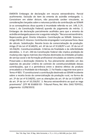 Rev. Trib. Reg. Trab. 3ª Reg., Belo Horizonte, v. 71, n. 111, p. 843-848, jan./jun. 2025848EMENTA Embargos de declaração em recurso extraordinário. Parcial acolhimento. Exclusão de item da ementa do acórdão embargado. 1. Consistiram em obiter dictum, não possuindo caráter vinculante, as considerações lançadas sobre a natureza jurídica da contribuição ao SENAR (e as consequências disso quanto à imunidade referida no art. 149, § 2º, inciso I, da Constituição Federal) quando do julgamento do mérito. 2. Embargos de declaração parcialmente acolhidos para que a ementa do acórdão embargado passe a ter a seguinte redação: “Recurso extraordinário. Repercussão geral. Direito tributário. Contribuição ao SENAR. Sistema S. Artigo 240 da CF. Alcance. Contribuinte empregador rural pessoa física. Base de cálculo. Substituição. Receita bruta da comercialização da produção. Artigo 2º da Lei nº 8.540/91, art. 6º da Lei nº 9.528/97 e art. 3º da Lei nº 10.256/01. Constitucionalidade. Critérios da finalidade e da referibilidade atendidos. 1. O art. 240 da Constituição Federal não implica proibição de mudança das regras matrizes dos tributos destinados às entidades privadas de serviço social e de formação profissional vinculadas ao sistema sindical. Preservada a destinação (Sistema S), fica plenamente atendido um dos aspectos do peculiar critério de controle de constitucionalidade dessas contribuições, que é a pertinência entre o destino efetivo do produto arrecadado e a finalidade da tributação. 2. Foi fixada a seguinte tese para o Tema nº 801: ‘É constitucional a contribuição destinada ao SENAR incidente sobre a receita bruta da comercialização da produção rural, na forma do art. 2º da Lei nº 8.540/92, com as alterações do art. 6º da Lei 9.528/97 e do art. 3º da Lei nº 10.256/01’. 3. Recurso extraordinário ao qual se nega provimento”. (STF RE 816830 ED - Tribunal Pleno, Rel. Min. DIAS TOFFOLI, julgamento: 12/09/2023)