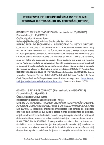 Rev. Trib. Reg. Trab. 3ª Reg., Belo Horizonte, v. 71, n. 111, p. 849-854, jan./jun. 2025849REFERÊNCIA DE JURISPRUDÊNCIA DO TRIBUNAL REGIONAL DO TRABALHO DA 3ª REGIÃO (TRT-MG)0010409-26.2025.5.03.0042 (ROPS) (PJe - assinado em 05/09/2025)Disponibilização: 08/09/2025.Órgão Julgador: Primeira TurmaRelator(a)/Redator(a): Adriana Goulart de Sena OrsiniINTEIRO TEOR: DE SUCUMBÊNCIA. BENEFICIÁRIO DA JUSTIÇA GRATUITA. CONTROLE DE CONSTITUCIONALIDADE E DE CONVENCIONALIDADE DO § 4º DO ARTIGO 791-A DA CLT. AÇÃO AJUIZADA, que o Poder Judiciário dos Estados-partes da Convenção Americana sobre Direitos Humanos exerça o controle de convencionalidade das normas jurídicas ... controle habitual, mas em folha de presença separada. Esse período era pago no holerite como “aula de módulo de educação infantil”, lançadas no ... , entre outros) e, ao contrário do controle de constitucionalidade, não se aplica a cláusula de reserva de plenário. 18. Sobre o tema em debate (TRT da 3.ª Região; PJe: 0010409-26.2025.5.03.0042 (ROPS); Disponibilização: 08/09/2025; Órgão Julgador: Primeira Turma; Relator(a)/Redator(a) Adriana Goulart de Sena Orsi. Disponível: Acórdão pode ser consultado na íntegra em: https://juris.trt3.jus.br/juris/consultaBaseCompleta.htm . Acesso em: 9 set. 2025.0010002-15.2024.5.03.0055 (ROT) (PJe - assinado em 05/09/2025)Disponibilização: 08/09/2025.Órgão Julgador: Oitava TurmaRelator(a)/Redator(a): José Marlon de FreitasDIREITO DO TRABALHO. RECURSO ORDINÁRIO. EQUIPARAÇÃO SALARIAL. ADICIONAL DE INSALUBRIDADE. JUROS E CORREÇÃO MONETÁRIA. I. CASO EM EXAME. 1. Recursos ordinários interpostos por ambos os litigantes em face da r. sentença que julgou parcialmente procedentes os pedidos, objetivando a reforma da decisão quanto à equiparação salarial, ao adicional de insalubridade, bem como sobre os critérios de juros e correção monetária. II. QUESTÃO EM DISCUSSÃO. 2. As questões em discussão consistem em: (I) definir se o reclamante faz jus à equiparação salarial; (II) estabelecer se o autor tem direito ao adicional de insalubridade e seus reflexos; (III) determinar quais os critérios de juros e correção monetária devem ser