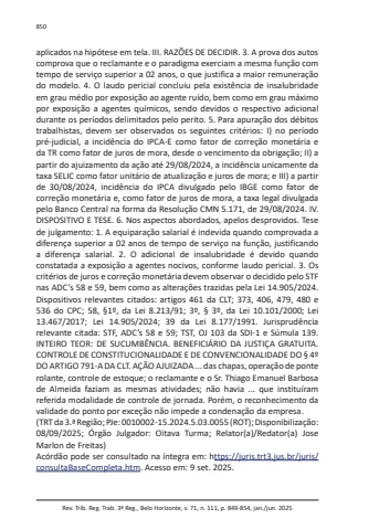 Rev. Trib. Reg. Trab. 3ª Reg., Belo Horizonte, v. 71, n. 111, p. 849-854, jan./jun. 2025850aplicados na hipótese em tela. III. RAZÕES DE DECIDIR. 3. A prova dos autos comprova que o reclamante e o paradigma exerciam a mesma função com tempo de serviço superior a 02 anos, o que justifica a maior remuneração do modelo. 4. O laudo pericial concluiu pela existência de insalubridade em grau médio por exposição ao agente ruído, bem como em grau máximo por exposição a agentes químicos, sendo devidos o respectivo adicional durante os períodos delimitados pelo perito. 5. Para apuração dos débitos trabalhistas, devem ser observados os seguintes critérios: I) no período pré-judicial, a incidência do IPCA-E como fator de correção monetária e da TR como fator de juros de mora, desde o vencimento da obrigação; II) a partir do ajuizamento da ação até 29/08/2024, a incidência unicamente da taxa SELIC como fator unitário de atualização e juros de mora; e III) a partir de 30/08/2024, incidência do IPCA divulgado pelo IBGE como fator de correção monetária e, como fator de juros de mora, a taxa legal divulgada pelo Banco Central na forma da Resolução CMN 5.171, de 29/08/2024. IV. DISPOSITIVO E TESE. 6. Nos aspectos abordados, apelos desprovidos. Tese de julgamento: 1. A equiparação salarial é indevida quando comprovada a diferença superior a 02 anos de tempo de serviço na função, justificando a diferença salarial. 2. O adicional de insalubridade é devido quando constatada a exposição a agentes nocivos, conforme laudo pericial. 3. Os critérios de juros e correção monetária devem observar o decidido pelo STF nas ADC’s 58 e 59, bem como as alterações trazidas pela Lei 14.905/2024. Dispositivos relevantes citados: artigos 461 da CLT; 373, 406, 479, 480 e 536 do CPC; 58, §1º, da Lei 8.213/91; 3º, § 3º, da Lei 10.101/2000; Lei 13.467/2017; Lei 14.905/2024; 39 da Lei 8.177/1991. Jurisprudência relevante citada: STF, ADC’s 58 e 59; TST, OJ 103 da SDI-1 e Súmula 139. INTEIRO TEOR: DE SUCUMBÊNCIA. BENEFICIÁRIO DA JUSTIÇA GRATUITA. CONTROLE DE CONSTITUCIONALIDADE E DE CONVENCIONALIDADE DO § 4º DO ARTIGO 791-A DA CLT. AÇÃO AJUIZADA ... das chapas, operação de ponte rolante, controle de estoque; o reclamante e o Sr. Thiago Emanuel Barbosa de Almeida faziam as mesmas atividades; não havia ... que instituíram referida modalidade de controle de jornada. Porém, o reconhecimento da validade do ponto por exceção não impede a condenação da empresa.(TRT da 3.ª Região; PJe: 0010002-15.2024.5.03.0055 (ROT); Disponibilização: 08/09/2025; Órgão Julgador: Oitava Turma; Relator(a)/Redator(a) Jose Marlon de Freitas)Acórdão pode ser consultado na íntegra em: https://juris.trt3.jus.br/juris/consultaBaseCompleta.htm. Acesso em: 9 set. 2025.