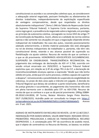 Rev. Trib. Reg. Trab. 3ª Reg., Belo Horizonte, v. 71, n. 111, p. 855-864, jan./jun. 2025863constitucionais os acordos e as convenções coletivos que, ao considerarem a adequação setorial negociada, pactuam limitações ou afastamentos de direitos trabalhistas, independentemente da explicitação especificada de vantagens compensatórias, desde que respeitados os direitos absolutamente indisponíveis” (Tema 1.046 da Tabela de Repercussão Geral do Supremo Tribunal Federal). A Suprema Corte reconheceu, portanto, como regra geral, a prevalência do negociado sobre o legislado, em prestígio ao princípio da autonomia coletiva, consagrado no inciso XXVI do artigo 7º da Constituição da República. Assim, afasta-se a validade da norma coletiva apenas e tão somente nas situações em que a negociação vilipendie direito indisponível do trabalhador. No caso dos autos, revendo posicionamento adotado anteriormente, o direito material postulado não está albergado no rol de direitos indisponíveis do trabalhador e, portanto, não têm viés constitucional direto, estando o seu alcance passível de supressão ou flexibilização via ajuste coletivo. Recurso de revista de que se conhece e a que se dá provimento. HONORÁRIOS ADVOCATÍCIOS SUCUMBENCIAIS. SUSPENSÃO DA EXIGIBILIDADE. TRANSCENDÊNCIA RECONHECIDA. No julgamento dos embargos de declaração da ADI nº 5.766, ocorrido em sessão virtual encerrada em 20/6/2022, o Supremo Tribunal Federal explicitou que, em relação ao § 4º do artigo 791-A da CLT, a declaração de inconstitucionalidade alcançou apenas a expressão “desde que não tenha obtido em juízo, ainda que em outro processo, créditos capazes de suportar a despesa”, remanescendo a possibilidade de suspensão da exigibilidade da cobrança, no prazo de dois anos após o trânsito em julgado. A decisão do Tribunal Regional que deixou de condenar a parte reclamante, beneficiária da justiça gratuita e sucumbente, ao pagamento dos honorários não está em plena harmonia com o decidido pelo STF na ADI-5766. Recurso de revista de que se conhece e a que se dá parcial provimento. (RRAg-20884-09.2018.5.04.0026, 8ª Turma, Relator Ministro Sergio Pinto Martins, DEJT 25/08/2025). Acórdão pode ser consultado na íntegra em: https://jurisprudencia.tst.jus.br/#79464bf607b9511154027d69dda6ef1. Acesso em: 9 set. 2025.AGRAVO DE INSTRUMENTO EM RECURSO DE REVISTA. LEI Nº 13.467/2017. INDENIZAÇÃO POR DANOS MORAIS. VALOR ARBITRADO. REEXAME FÁTICOPROBATÓRIO. PREJUDICADA A ANÁLISE DA TRANSCENDÊNCIA. RECURSO DESPROVIDO. 1. A constatação pelo TRT da ocorrência de assédio moral, que é objeto de controvérsia no Recurso de Revista, se baseou na análise