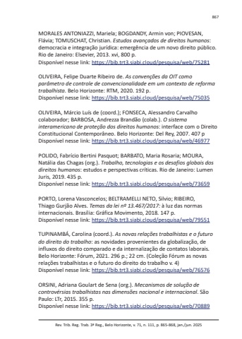 Rev. Trib. Reg. Trab. 3ª Reg., Belo Horizonte, v. 71, n. 111, p. 865-868, jan./jun. 2025867MORALES ANTONIAZZI, Mariela; BOGDANDY, Armin von; PIOVESAN, Flávia; TOMUSCHAT, Christian. Estudos avançados de direitos humanos: democracia e integração jurídica: emergência de um novo direito público. Rio de Janeiro: Elsevier, 2013. xvi, 800 p. Disponível nesse link: https://bib.trt3.siabi.cloud/pesquisa/web/75281OLIVEIRA, Felipe Duarte Ribeiro de. As convenções da OIT como parâmetro de controle de convencionalidade em um contexto de reforma trabalhista. Belo Horizonte: RTM, 2020. 192 p.Disponível nesse link: https://bib.trt3.siabi.cloud/pesquisa/web/75035OLIVEIRA, Márcio Luís de (coord.); FONSECA, Alessandro Carvalho colaborador; BARBOSA, Andrezza Brandão (colab.). O sistema interamericano de proteção dos direitos humanos: interface com o Direito Constitucional Contemporâneo. Belo Horizonte: Del Rey, 2007. 407 pDisponível nesse link: https://bib.trt3.siabi.cloud/pesquisa/web/46977POLIDO, Fabrício Bertini Pasquot; BARBATO, Maria Rosaria; MOURA, Natália das Chagas (org.). Trabalho, tecnologias e os desafios globais dos direitos humanos: estudos e perspectivas críticas. Rio de Janeiro: Lumen Juris, 2019. 435 p.Disponível nesse link: https://bib.trt3.siabi.cloud/pesquisa/web/73659PORTO, Lorena Vasconcelos; BELTRAMELLI NETO, Silvio; RIBEIRO, Thiago Gurjão Alves. Temas da lei nº 13.467/2017: à luz das normas internacionais. Brasília: Gráfica Movimento, 2018. 147 p.Disponível nesse link: https://bib.trt3.siabi.cloud/pesquisa/web/79551TUPINAMBÁ, Carolina (coord.). As novas relações trabalhistas e o futuro do direito do trabalho: as novidades provenientes da globalização, de influxos do direito comparado e da internalização de contatos laborais. Belo Horizonte: Fórum, 2021. 296 p.; 22 cm. (Coleção Fórum as novas relações trabalhistas e o futuro do direito do trabalho v. 4)Disponível nesse link: https://bib.trt3.siabi.cloud/pesquisa/web/76576ORSINI, Adriana Goulart de Sena (org.). Mecanismos de solução de controvérsias trabalhistas nas dimensões nacional e internacional. São Paulo: LTr, 2015. 355 p.Disponível nesse link: https://bib.trt3.siabi.cloud/pesquisa/web/70889