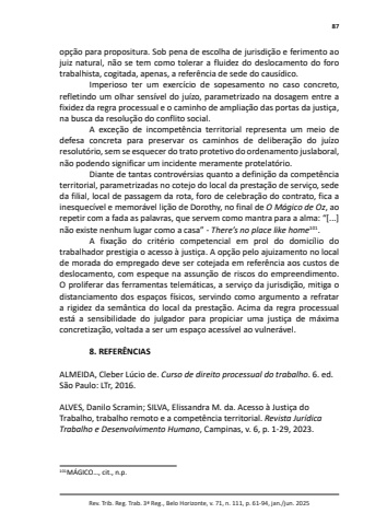 87Rev. Trib. Reg. Trab. 3ª Reg., Belo Horizonte, v. 71, n. 111, p. 61-94, jan./jun. 2025opção para propositura. Sob pena de escolha de jurisdição e ferimento ao juiz natural, não se tem como tolerar a fluidez do deslocamento do foro trabalhista, cogitada, apenas, a referência de sede do causídico.Imperioso ter um exercício de sopesamento no caso concreto, refletindo um olhar sensível do juízo, parametrizado na dosagem entre a fixidez da regra processual e o caminho de ampliação das portas da justiça, na busca da resolução do conflito social.A exceção de incompetência territorial representa um meio de defesa concreta para preservar os caminhos de deliberação do juízo resolutório, sem se esquecer do trato protetivo do ordenamento juslaboral, não podendo significar um incidente meramente protelatório.Diante de tantas controvérsias quanto a definição da competência territorial, parametrizadas no cotejo do local da prestação de serviço, sede da filial, local de passagem da rota, foro de celebração do contrato, fica a inesquecível e memorável lição de Dorothy, no final de O Mágico de Oz, ao repetir com a fada as palavras, que servem como mantra para a alma: “[...] não existe nenhum lugar como a casa” - There’s no place like home101.A fixação do critério competencial em prol do domicílio do trabalhador prestigia o acesso à justiça. A opção pelo ajuizamento no local de morada do empregado deve ser cotejada em referência aos custos de deslocamento, com espeque na assunção de riscos do empreendimento. O proliferar das ferramentas telemáticas, a serviço da jurisdição, mitiga o distanciamento dos espaços físicos, servindo como argumento a refratar a rigidez da semântica do local da prestação. Acima da regra processual está a sensibilidade do julgador para propiciar uma justiça de máxima concretização, voltada a ser um espaço acessível ao vulnerável.8. REFERÊNCIASALMEIDA, Cleber Lúcio de. Curso de direito processual do trabalho. 6. ed. São Paulo: LTr, 2016. ALVES, Danilo Scramin; SILVA, Elissandra M. da. Acesso à Justiça do Trabalho, trabalho remoto e a competência territorial. Revista Jurídica Trabalho e Desenvolvimento Humano, Campinas, v. 6, p. 1-29, 2023.101 MÁGICO…, cit., n.p.