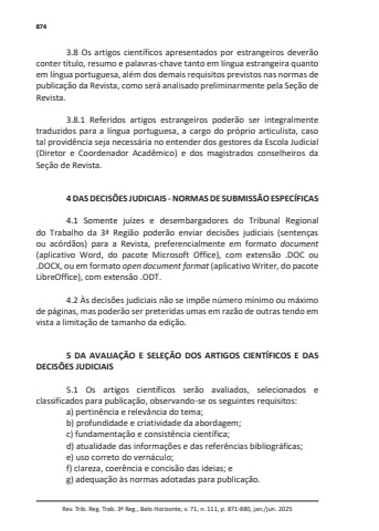 874Rev. Trib. Reg. Trab. 3ª Reg., Belo Horizonte, v. 71, n. 111, p. 871-880, jan./jun. 20253.8 Os artigos científicos apresentados por estrangeiros deverão conter título, resumo e palavras-chave tanto em língua estrangeira quanto em língua portuguesa, além dos demais requisitos previstos nas normas de publicação da Revista, como será analisado preliminarmente pela Seção de Revista.3.8.1 Referidos artigos estrangeiros poderão ser integralmente traduzidos para a língua portuguesa, a cargo do próprio articulista, caso tal providência seja necessária no entender dos gestores da Escola Judicial (Diretor e Coordenador Acadêmico) e dos magistrados conselheiros da Seção de Revista.4 DAS DECISÕES JUDICIAIS - NORMAS DE SUBMISSÃO ESPECÍFICAS4.1 Somente juízes e desembargadores do Tribunal Regional do Trabalho da 3ª Região poderão enviar decisões judiciais (sentenças ou acórdãos) para a Revista, preferencialmente em formato document(aplicativo Word, do pacote Microsoft Office), com extensão .DOC ou .DOCX, ou em formato open document format (aplicativo Writer, do pacote LibreOffice), com extensão .ODT.4.2 Às decisões judiciais não se impõe número mínimo ou máximo de páginas, mas poderão ser preteridas umas em razão de outras tendo em vista a limitação de tamanho da edição.5 DA AVALIAÇÃO E SELEÇÃO DOS ARTIGOS CIENTÍFICOS E DAS DECISÕES JUDICIAIS5.1 Os artigos científicos serão avaliados, selecionados e classificados para publicação, observando-se os seguintes requisitos:a) pertinência e relevância do tema;b) profundidade e criatividade da abordagem;c) fundamentação e consistência científica;d) atualidade das informações e das referências bibliográficas;e) uso correto do vernáculo;f) clareza, coerência e concisão das ideias; eg) adequação às normas adotadas para publicação.