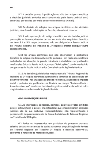 876Rev. Trib. Reg. Trab. 3ª Reg., Belo Horizonte, v. 71, n. 111, p. 871-880, jan./jun. 20255.7 A decisão quanto à publicação ou não dos artigos científicos e decisões judiciais enviados será comunicada pela Escola Judicial ao(s) autor(es), por escrito por meio de correio eletrônico (e-mail).5.8 Da decisão de seleção dos artigos científicos e das decisões judiciais, para fins de publicação na Revista, não caberá recurso.5.9 A não aprovação do artigo científico ou da decisão judicial pressupõe o descumprimento de um ou mais dos requisitos descritos no item 5.1 e 5.5 respectivamente, não se obrigando a Escola Judicial do Tribunal Regional do Trabalho da 3ª Região a prestar qualquer outro esclarecimento.5.10 Os artigos científicos que não observarem a pertinência temática da edição em desenvolvimento poderão - em razão da excelência do trabalho nas situações de grande relevância e atualidade - ser publicados no sítio eletrônico da Escola Judicial, campo \dos gestores da Escola Judicial e dos Conselheiros da Seção de Revista.5.11 As decisões judiciais dos magistrados do Tribunal Regional do Trabalho da 3ª Região estranhas à pertinência temática de cada edição em desenvolvimento - nas situações de grande relevância, atualidade e impacto social - poderão ser publicadas na Revista no campo \Assuntos diversos\magistrados conselheiros da Seção de Revista.6 DAS DISPOSIÇÕES FINAIS6.1 As impressões, conceitos, opiniões, palavras e votos emitidos pelo(s) articulista(s) e pelo(s) magistrado(s) que encaminharem decisões judiciais são de sua exclusiva responsabilidade, não representando o pensamento ou posicionamento da Escola Judicial ou do Tribunal Regional do Trabalho da 3ª Região.6.2 Todos os interessados em participar do presente processo seletivo declaram-se cientes de todas as normas de publicação da Revista do Tribunal Regional do Trabalho 3ª Região e deverão observá-las, conforme a natureza do material enviado.