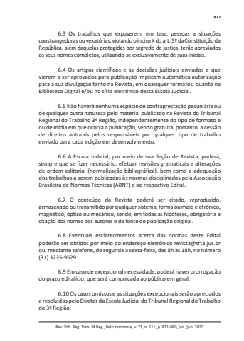 877Rev. Trib. Reg. Trab. 3ª Reg., Belo Horizonte, v. 71, n. 111, p. 871-880, jan./jun. 20256.3 Os trabalhos que expuserem, em tese, pessoas a situações constrangedoras ou vexatórias, violando o inciso X do art. 5º da Constituição da República, além daquelas protegidas por segredo de justiça, terão abreviados os seus nomes completos, utilizando-se exclusivamente de suas iniciais.6.4 Os artigos científicos e as decisões judiciais enviados e que vierem a ser aprovados para publicação implicam automática autorização para a sua divulgação tanto na Revista, em quaisquer formatos, quanto na Biblioteca Digital e/ou no sítio eletrônico desta Escola Judicial.6.5 Não haverá nenhuma espécie de contraprestação pecuniária ou de qualquer outra natureza pelo material publicado na Revista do Tribunal Regional do Trabalho 3ª Região, independentemente do tipo de formato e ou de mídia em que ocorra a publicação, sendo gratuita, portanto, a cessão de direitos autorais pelos responsáveis por qualquer tipo de trabalho enviado para cada edição em desenvolvimento.6.6 A Escola Judicial, por meio de sua Seção de Revista, poderá, sempre que se fizer necessário, efetuar revisões gramaticais e alterações de ordem editorial (normalização bibliográfica), bem como a adequação dos trabalhos a serem publicados às normas disciplinadas pela Associação Brasileira de Normas Técnicas (ABNT) e ao respectivo Edital.6.7 O conteúdo da Revista poderá ser citado, reproduzido, armazenado ou transmitido por qualquer sistema, forma ou meio eletrônico, magnético, óptico ou mecânico, sendo, em todas as hipóteses, obrigatória a citação dos nomes dos autores e da fonte de publicação original.6.8 Eventuais esclarecimentos acerca das normas deste Edital poderão ser obtidos por meio do endereço eletrônico revista@trt3.jus.br ou, mediante telefone, de segunda a sexta-feira, das 8h às 18h, no número (31) 3235-9529.6.9 Em caso de excepcional necessidade, poderá haver prorrogação do prazo editalício, que será comunicada ao público em geral.6.10 Os casos omissos e as situações excepcionais serão apreciados e resolvidos pelo Diretor da Escola Judicial do Tribunal Regional do Trabalho da 3ª Região.