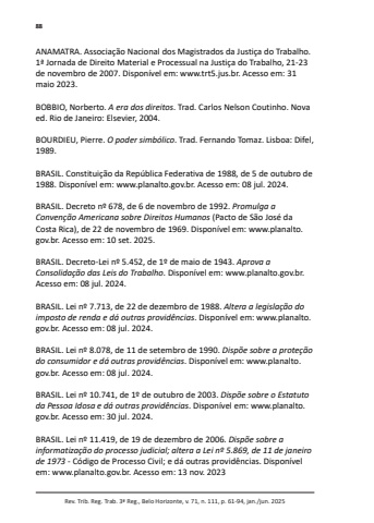 88Rev. Trib. Reg. Trab. 3ª Reg., Belo Horizonte, v. 71, n. 111, p. 61-94, jan./jun. 2025ANAMATRA. Associação Nacional dos Magistrados da Justiça do Trabalho. 1ª Jornada de Direito Material e Processual na Justiça do Trabalho, 21-23 de novembro de 2007. Disponível em: www.trt5.jus.br. Acesso em: 31 maio 2023.BOBBIO, Norberto. A era dos direitos. Trad. Carlos Nelson Coutinho. Nova ed. Rio de Janeiro: Elsevier, 2004.BOURDIEU, Pierre. O poder simbólico. Trad. Fernando Tomaz. Lisboa: Difel, 1989. BRASIL. Constituição da República Federativa de 1988, de 5 de outubro de 1988. Disponível em: www.planalto.gov.br. Acesso em: 08 jul. 2024.BRASIL. Decreto nº 678, de 6 de novembro de 1992. Promulga a Convenção Americana sobre Direitos Humanos (Pacto de São José da Costa Rica), de 22 de novembro de 1969. Disponível em: www.planalto.gov.br. Acesso em: 10 set. 2025.BRASIL. Decreto-Lei nº 5.452, de 1º de maio de 1943. Aprova a Consolidação das Leis do Trabalho. Disponível em: www.planalto.gov.br. Acesso em: 08 jul. 2024.BRASIL. Lei nº 7.713, de 22 de dezembro de 1988. Altera a legislação do imposto de renda e dá outras providências. Disponível em: www.planalto.gov.br. Acesso em: 08 jul. 2024.BRASIL. Lei nº 8.078, de 11 de setembro de 1990. Dispõe sobre a proteção do consumidor e dá outras providências. Disponível em: www.planalto.gov.br. Acesso em: 08 jul. 2024.BRASIL. Lei nº 10.741, de 1º de outubro de 2003. Dispõe sobre o Estatuto da Pessoa Idosa e dá outras providências. Disponível em: www.planalto.gov.br. Acesso em: 30 jul. 2024. BRASIL. Lei nº 11.419, de 19 de dezembro de 2006. Dispõe sobre a informatização do processo judicial; altera a Lei nº 5.869, de 11 de janeiro de 1973 - Código de Processo Civil; e dá outras providências. Disponível em: www.planalto.gov.br. Acesso em: 13 nov. 2023