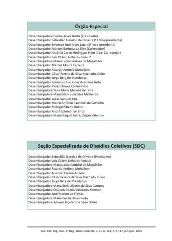 Rev. Trib. Reg. Trab. 3ª Reg., Belo Horizonte, v. 71, n. 111, p. 07-17, jan./jun. 2025Seção Especializada de Dissídios Coletivos (SDC)Desembargador Sebastião Geraldo de Oliveira (Presidente)Desembargador Luiz Otávio Linhares RenaultDesembargadora Maria Lúcia Cardoso de MagalhãesDesembargador Ricardo Antônio MohallemDesembargador Anemar Pereira AmaralDesembargador César Pereira da Silva Machado JúniorDesembargador Jorge Berg de MendonçaDesembargadora Maria Stela Álvares da Silva CamposDesembargadora Cristiana Maria Valadares FenelonDesembargador José Marlon de FreitasDesembargadora Maria Cecília Alves PintoDesembargadora Adriana Goulart de Sena OrsiniÓrgão EspecialDesembargadora Denise Alves Horta (Presidente)Desembargador Sebastião Geraldo de Oliveira (1º Vice-presidente)Desembargador Emerson José Alves Lage (2º Vice-presidente)Desembargador Manoel Barbosa da Silva (Corregedor)Desembargador Antônio Carlos Rodrigues Filho (Vice-Corregedor)Desembargador Luiz Otávio Linhares RenaultDesembargadora Maria Lúcia Cardoso de MagalhãesDesembargador Marcus Moura FerreiraDesembargador Ricardo Antônio MohallemDesembargador César Pereira da Silva Machado JúniorDesembargador Jorge Berg de MendonçaDesembargador Fernando Luiz Gonçalves Rios NetoDesembargador Paulo Chaves Corrêa FilhoDesembargadora Taisa Maria Macena de LimaDesembargadora Maristela Íris da Silva MalheirosDesembargador Lucas Vanucci LinsDesembargador Marco Antônio Paulinelli de CarvalhoDesembargador Rodrigo Ribeiro BuenoDesembargador André Schmidt de BritoDesembargadora Maria Raquel Ferraz Zagari Valentim