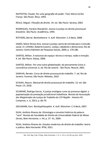 91Rev. Trib. Reg. Trab. 3ª Reg., Belo Horizonte, v. 71, n. 111, p. 61-94, jan./jun. 2025RAFFESTIN, Claude. Por uma geografia do poder. Trad. Maria Cecília França. São Paulo: Ática, 1993.REALE, Miguel. Filosofia do direito. 19. ed. São Paulo: Saraiva, 2002.RODRIGUES, Horácio Wanderlei. Acesso à justiça no direito processual brasileiro. São Paulo: Acadêmica, 1994.RÜTHERS, Bernd. Rechtstheorie. 4. Aufl. München: C.H.Beck, 2008.SADEK, Maria Tereza Aina. Acesso à justiça: porta de entrada para a inclusão social. In: LIVIANU, Roberto (coord.). Justiça, cidadania e democracia. Rio de Janeiro: Centro Edelstein de Pesquisas Sociais, 2009, p. 170-180.SANTOS, Milton. A natureza do espaço: técnica e tempo, razão e emoção. 4. ed. São Paulo: Edusp, 2006.SANTOS, Milton. Por uma outra globalização: do pensamento único à consciência universal. 6. ed. Rio de Janeiro - São Paulo: Record, 2001.SARAIVA, Renato. Curso de direito processual do trabalho. 7. ed. Rio de Janeiro: Forense; São Paulo: Método, 2010.SCHIAVI, Mauro. Manual de direito processual do trabalho. 13. ed. São Paulo: LTr, 2018.SCHWARZ, Rodrigo Garcia. A justiça analógica rumo ao processo digital: a pejotaeização da prestação jurisdicional trabalhista. Revista da Associação dos Magistrados da Justiça do Trabalho da 15ª Região - Amatra XV, Campinas, n. 6, 2013, p. 66-79.SEELMANN, Kurt. Rechtsphilosophie. 4. Aufl. München: C.H.Beck, 2007.SILVA, Antônio Álvares da. Etimologia e conceito histórico da palavra “vara”. Revista da Faculdade de Direito da Universidade Federal de Minas Gerais, Belo Horizonte, n. 44, p. 27- 41, 2004.SILVA, Antônio Álvares da. Estudos modernos de direito do trabalho: teoria e prática. Belo Horizonte: RTM, 2021.