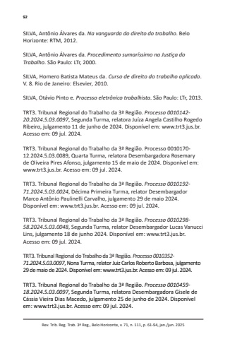 92Rev. Trib. Reg. Trab. 3ª Reg., Belo Horizonte, v. 71, n. 111, p. 61-94, jan./jun. 2025SILVA, Antônio Álvares da. Na vanguarda do direito do trabalho. Belo Horizonte: RTM, 2012.SILVA, Antônio Álvares da. Procedimento sumaríssimo na Justiça do Trabalho. São Paulo: LTr, 2000.SILVA, Homero Batista Mateus da. Curso de direito do trabalho aplicado. V. 8. Rio de Janeiro: Elsevier, 2010.SILVA, Otávio Pinto e. Processo eletrônico trabalhista. São Paulo: LTr, 2013.TRT3. Tribunal Regional do Trabalho da 3ª Região. Processo 0010142-20.2024.5.03.0097, Segunda Turma, relatora Juíza Angela Castilho Rogedo Ribeiro, julgamento 11 de junho de 2024. Disponível em: www.trt3.jus.br. Acesso em: 09 jul. 2024.TRT3. Tribunal Regional do Trabalho da 3ª Região. Processo 0010170-12.2024.5.03.0089, Quarta Turma, relatora Desembargadora Rosemary de Oliveira Pires Afonso, julgamento 15 de maio de 2024. Disponível em: www.trt3.jus.br. Acesso em: 09 jul. 2024.TRT3. Tribunal Regional do Trabalho da 3ª Região. Processo 0010192-71.2024.5.03.0024, Décima Primeira Turma, relator Desembargador Marco Antônio Paulinelli Carvalho, julgamento 29 de maio 2024. Disponível em: www.trt3.jus.br. Acesso em: 09 jul. 2024.TRT3. Tribunal Regional do Trabalho da 3ª Região. Processo 0010298-58.2024.5.03.0048, Segunda Turma, relator Desembargador Lucas Vanucci Lins, julgamento 18 de junho 2024. Disponível em: www.trt3.jus.br. Acesso em: 09 jul. 2024.TRT3. Tribunal Regional do Trabalho da 3ª Região. Processo 0010352-71.2024.5.03.0097, Nona Turma, relator Juiz Carlos Roberto Barbosa, julgamento 29 de maio de 2024. Disponível em: www.trt3.jus.br. Acesso em: 09 jul. 2024.TRT3. Tribunal Regional do Trabalho da 3ª Região. Processo 0010459-18.2024.5.03.0097, Segunda Turma, relatora Desembargadora Gisele de Cássia Vieira Dias Macedo, julgamento 25 de junho de 2024. Disponível em: www.trt3.jus.br. Acesso em: 09 jul. 2024.