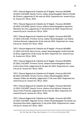 93Rev. Trib. Reg. Trab. 3ª Reg., Belo Horizonte, v. 71, n. 111, p. 61-94, jan./jun. 2025TRT3. Tribunal Regional do Trabalho da 3ª Região. Processo 0010699-58.2023.5.03.0059, Quinta Turma, relator Desembargador Marcos Penido de Oliveira, julgamento 07 de maio de 2024. Disponível em: www.trt3.jus.br. Acesso em: 09 jul. 2024.TRT3. Tribunal Regional do Trabalho da 3ª Região. Processo 0010695-30.2023.5.03.0056, Quinta Turma, relatora Desembargadora Jaqueline Monteiro de Lima, julgamento 27 de fevereiro de 2024. Disponível em: www.trt3.jus.br. Acesso em: 09 jul. 2024.TRT3. Tribunal Regional do Trabalho da 3ª Região. Processo 0010709-27.2023.5.03.0181, Primeira Turma, relator Desembargador Luiz Otávio Linhares Renault, julgamento 16 de maio de 2024. Disponível em: www.trt3.jus.br. Acesso em: 09 jul. 2024.TRT3. Tribunal Regional do Trabalho da 3ª Região. Processo 0010891-57.2023.5.03.0134, Nona Turma, relator Desembargador André Schmidt de Brito, julgamento 13 de março de 2024. Disponível em: www.trt3.jus.br. Acesso em: 09 jul. 2024.TRT3. Tribunal Regional do Trabalho da 3ª Região. Processo 0010904-07.2022.5.03.0097, Primeira Turma, relatora Desembargadora Maria Cecília Alves Pinto, julgamento 01 de abril de 2024. Disponível em: www.trt3.jus.br. Acesso em: 09 jul. 2024.TRT3. Tribunal Regional do Trabalho da 3ª Região. Processo 0011019-86.2023.5.03.0034, Terceira Turma, relator Desembargador Milton Vasques Thibau de Almeida, julgamento 27 de maio 2024. Disponível em: www.trt3.jus.br. Acesso em: 09 jul. 2024.TRT3. Tribunal Regional do Trabalho da 3ª Região. Processo 0011023-31.2023.5.03.0097, Quarta Turma, relatora Juíza Adriana Campos de Souza Freire Pimenta, julgamento 29 de maio de 2024. Disponível em: www.trt3.jus.br. Acesso em: 09 jul. 2024.TRT3. Tribunal Regional do Trabalho da 3ª Região. Processo 0011094-33.2023.5.03.0097, Segunda Turma, relator Desembargador Fernando Luiz Gonçalves Rios Neto, julgamento 11 de junho 2024. Disponível em: www.trt3.jus.br. Acesso em: 09 jul. 2024.