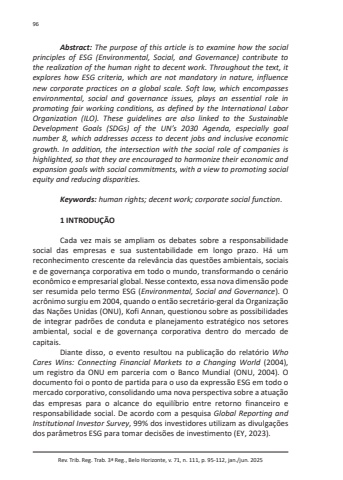 Rev. Trib. Reg. Trab. 3ª Reg., Belo Horizonte, v. 71, n. 111, p. 95-112, jan./jun. 202596Abstract: The purpose of this article is to examine how the social principles of ESG (Environmental, Social, and Governance) contribute to the realization of the human right to decent work. Throughout the text, it explores how ESG criteria, which are not mandatory in nature, influence new corporate practices on a global scale. Soft law, which encompasses environmental, social and governance issues, plays an essential role in promoting fair working conditions, as defined by the International Labor Organization (ILO). These guidelines are also linked to the Sustainable Development Goals (SDGs) of the UN’s 2030 Agenda, especially goal number 8, which addresses access to decent jobs and inclusive economic growth. In addition, the intersection with the social role of companies is highlighted, so that they are encouraged to harmonize their economic and expansion goals with social commitments, with a view to promoting social equity and reducing disparities.Keywords: human rights; decent work; corporate social function. 1 INTRODUÇÃOCada vez mais se ampliam os debates sobre a responsabilidade social das empresas e sua sustentabilidade em longo prazo. Há um reconhecimento crescente da relevância das questões ambientais, sociais e de governança corporativa em todo o mundo, transformando o cenário econômico e empresarial global. Nesse contexto, essa nova dimensão pode ser resumida pelo termo ESG (Environmental, Social and Governance). O acrônimo surgiu em 2004, quando o então secretário-geral da Organização das Nações Unidas (ONU), Kofi Annan, questionou sobre as possibilidades de integrar padrões de conduta e planejamento estratégico nos setores ambiental, social e de governança corporativa dentro do mercado de capitais.Diante disso, o evento resultou na publicação do relatório Who Cares Wins: Connecting Financial Markets to a Changing World (2004), um registro da ONU em parceria com o Banco Mundial (ONU, 2004). O documento foi o ponto de partida para o uso da expressão ESG em todo o mercado corporativo, consolidando uma nova perspectiva sobre a atuação das empresas para o alcance do equilíbrio entre retorno financeiro e responsabilidade social. De acordo com a pesquisa Global Reporting and Institutional Investor Survey, 99% dos investidores utilizam as divulgações dos parâmetros ESG para tomar decisões de investimento (EY, 2023).