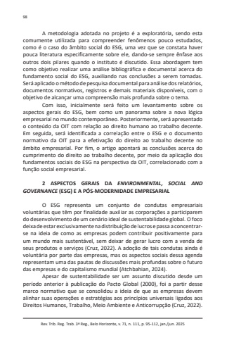 Rev. Trib. Reg. Trab. 3ª Reg., Belo Horizonte, v. 71, n. 111, p. 95-112, jan./jun. 202598A metodologia adotada no projeto é a exploratória, sendo esta comumente utilizada para compreender fenômenos pouco estudados, como é o caso do âmbito social do ESG, uma vez que se constata haver pouca literatura especificamente sobre ele, dando-se sempre ênfase aos outros dois pilares quando o instituto é discutido. Essa abordagem tem como objetivo realizar uma análise bibliográfica e documental acerca do fundamento social do ESG, auxiliando nas conclusões a serem tomadas. Será aplicado o método de pesquisa documental para análise dos relatórios, documentos normativos, registros e demais materiais disponíveis, com o objetivo de alcançar uma compreensão mais profunda sobre o tema.Com isso, inicialmente será feito um levantamento sobre os aspectos gerais do ESG, bem como um panorama sobre a nova lógica empresarial no mundo contemporâneo. Posteriormente, será apresentado o conteúdo da OIT com relação ao direito humano ao trabalho decente. Em seguida, será identificada a correlação entre o ESG e o documento normativo da OIT para a efetivação do direito ao trabalho decente no âmbito empresarial. Por fim, o artigo apontará as conclusões acerca do cumprimento do direito ao trabalho decente, por meio da aplicação dos fundamentos sociais do ESG na perspectiva da OIT, correlacionado com a função social empresarial. 2 ASPECTOS GERAIS DA ENVIRONMENTAL, SOCIAL AND GOVERNANCE (ESG) E A PÓS-MODERNIDADE EMPRESARIALO ESG representa um conjunto de condutas empresariais voluntárias que têm por finalidade auxiliar as corporações a participarem do desenvolvimento de um cenário ideal de sustentabilidade global. O foco deixa de estar exclusivamente na distribuição de lucros e passa a concentrarse na ideia de como as empresas podem contribuir positivamente para um mundo mais sustentável, sem deixar de gerar lucro com a venda de seus produtos e serviços (Cruz, 2022). A adoção de tais condutas ainda é voluntária por parte das empresas, mas os aspectos sociais dessa agenda representam uma das pautas de discussões mais profundas sobre o futuro das empresas e do capitalismo mundial (Atchbahian, 2024).Apesar de sustentabilidade ser um assunto discutido desde um período anterior à publicação do Pacto Global (2000), foi a partir desse marco normativo que se consolidou a ideia de que as empresas devem alinhar suas operações e estratégias aos princípios universais ligados aos Direitos Humanos, Trabalho, Meio Ambiente e Anticorrupção (Cruz, 2022).